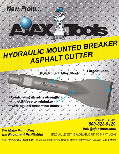 Ajax Tools Demolition Tool Catalog (952 KB, 37 pages) Our full demolition product line catalog in pdf format, complete with demolition tools for hydraulic mounted breakers. Ajax Demolition Tools are available with the following point styles–Blunt, Cross-Cut flat, In-Line Flat, Moil Point, Conical Point, Deck Busters, and Asphalt Cutters.